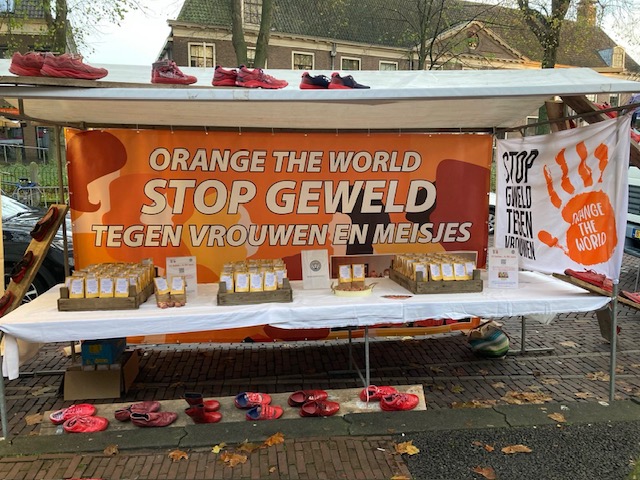 op de zaterdag markt te Hoorn werd aandacht gevraagd voor Orange the World. Er werden oranje tulpenbollen verkocht voor ondersteuning aan dnoDoen