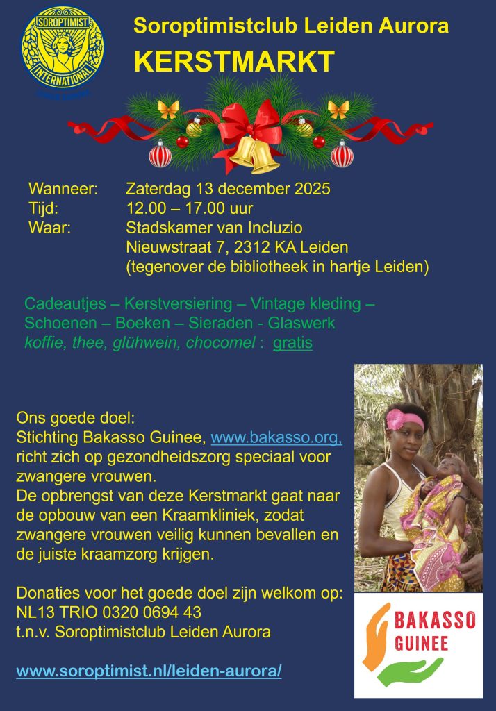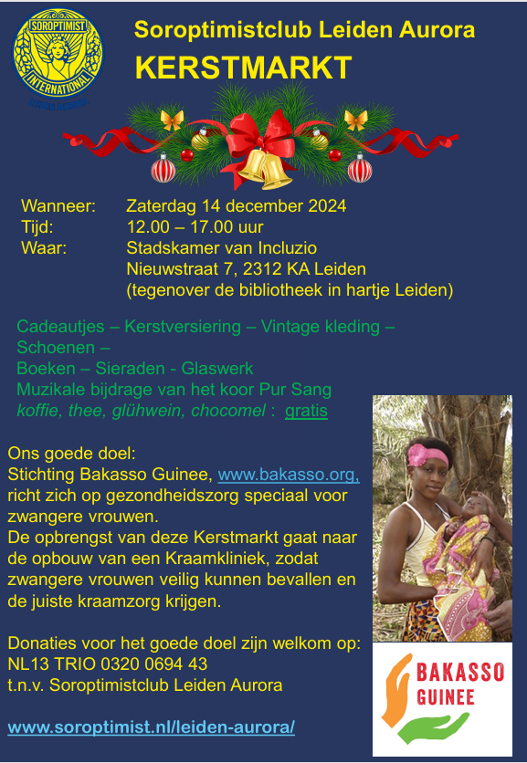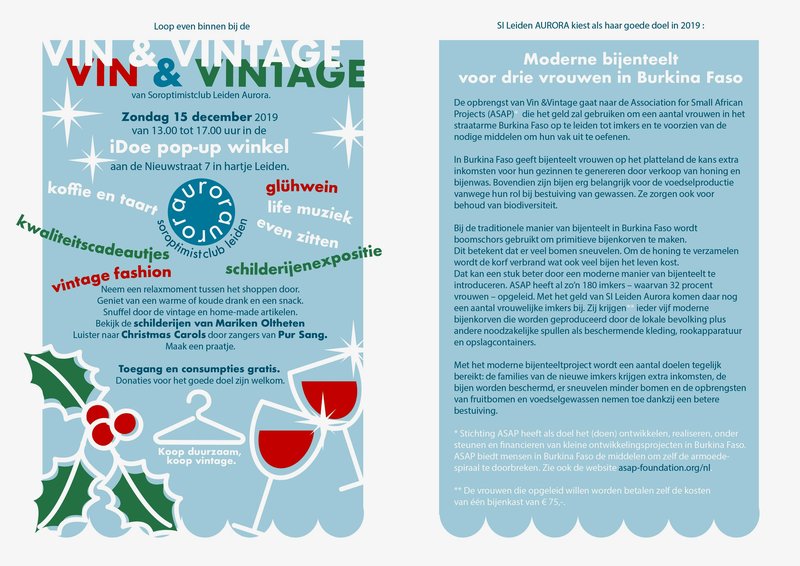 Zondag 15 december 2019 is de oude Leidse binnenstad een bezoek waard. Loop dan tussen 13.00 en 17.00 uur meteen even binnen bij de pop-up winkel van Soroptimistclub Leiden Aurora aan de Nieuwstraat 7 (tegenover bibliotheek). Gratis koffie/thee/glühwein + snack, mooie vintage en home-made cadeautjes te koop, live christmas carols, schilderijenexpositie. Alles voor het goede doel: een project in Burkina Faso waar vrouwen worden opgeleid tot imker zodat ze hun gezinsinkomen kunnen aanvullen.