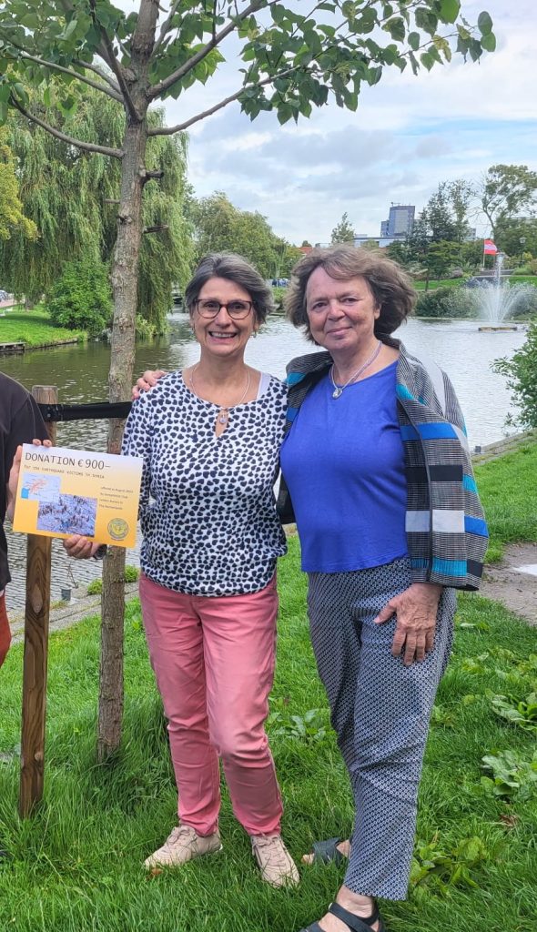 Voorzitter Brigit Nijsten en secretaris Frouke Welling van Leiden Aurora hebben zaterdag 12 augustus 2023 een cheque van 900 euro overhandigd voor Syrische slachtoffers van de aardbeving van 6 februari. Vooral het noorden van Syrië is zwaar getroffen en heeft nog altijd tekort aan de eerste levensbehoeften. Het Syrische regime maakt het lastig hier hulp te bieden, maar dankzij contacten ter plekke weten we zeker dat dit geld op de goede plek terecht komt.