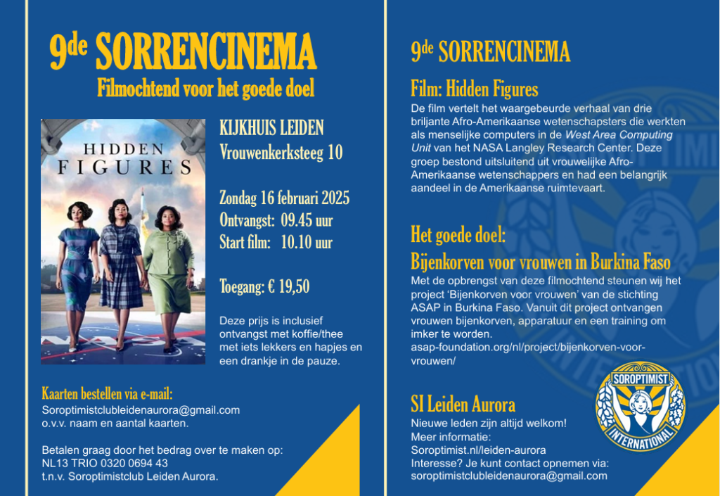 Onze 9e Sorrencinema, op zondagochtend 16 februari, was weer een groot succes. Bijna honderd bezoekers kwamen naar het Kijkhuis in Leiden voor een heerlijke filmochtend. Iedereen genoot van de film ‘Hidden Figures’, de koffie/thee met lekkers vooraf en de bubbels en hapjes in de pauze. Mede dankzij de loterij en de verkoop van mooie spullen bracht de ochtend 1.650 euro op voor ons goede doel: het project Bijenkorven voor Vrouwen van de Stichting Association for Small African Projects (ASAP),