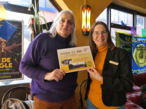 Dankzij een donatie van 150 euro het konden we uiteindelijk een cheque van 1.800 euro overhandigen aan Bakasso. Op de foto hieronder ontvangt José Schraauwers van Bakasso de cheque uit handen van secretaris Karien Loykens van Leiden Aurora.