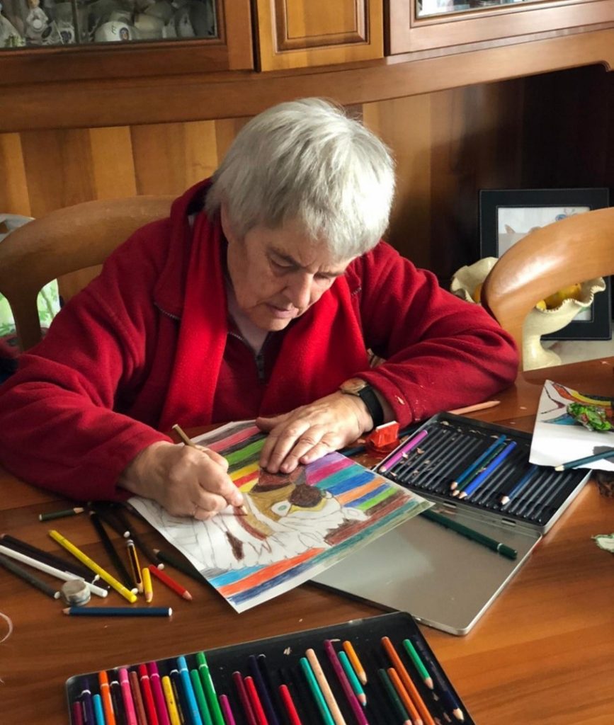 De tekeningen op de kaarten zijn gemaakt door Aurora Zanardi, de gehandicapte zus van een van onze leden. Ze woont samen met haar moeder vlakbij Bergamo (Italië), een stad die in 2020 ontzettend zwaar getroffen werd door corona. Tijdens de strenge lockdown van dat jaar kon ze niet naar buiten en niemand zien. Ze heeft haar tekentalent kunnen gebruiken om deze moeilijke tijd door te komen…