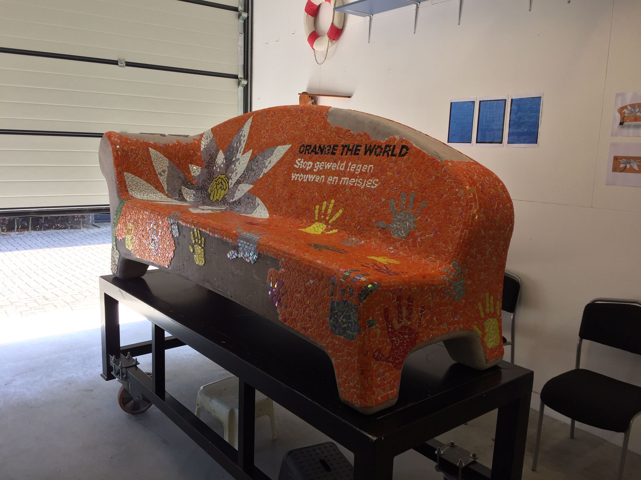 Deze Orange Social Sofa komt te staan op het Kooiplein in Leiden. Het is een project van Soroptimistclub Leiden Aurora in samenwerking met Huis van de Buurt de Kooi. De bank fleurt straks niet alleen het plein op maar brengt ook een belangrijke boodschap: Stop geweld tegen vrouwen en meisjes!