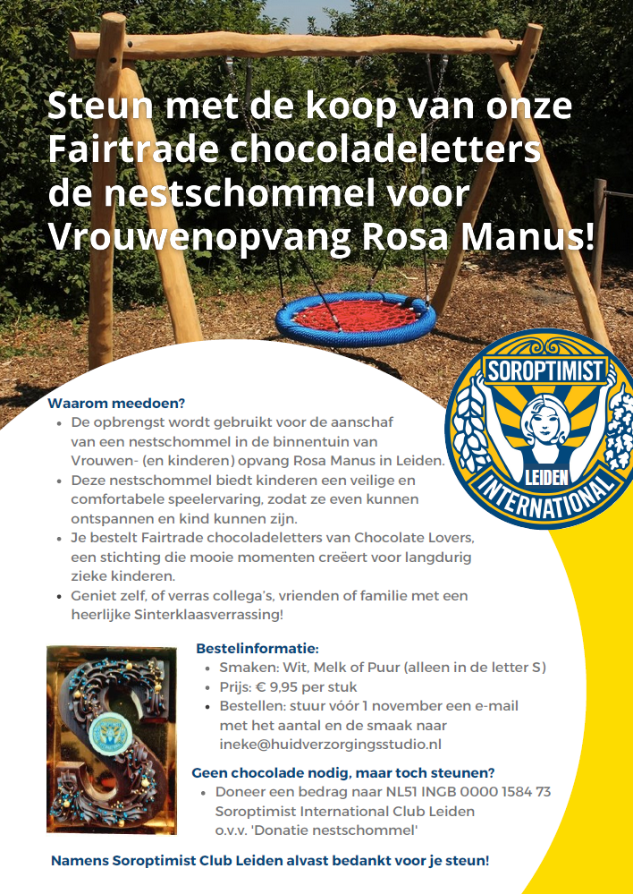 Fairtrade chocolade letters voor de nestschommel voor vrouwenopvang Rosa Manus Steun met de koop van onze fairtrade chocoladeletters de nestschommel voor Vrouwenopvang Rosa Manus