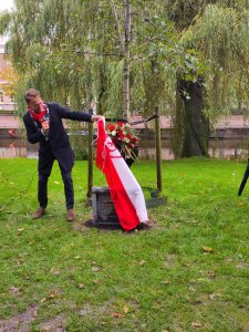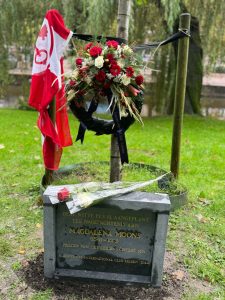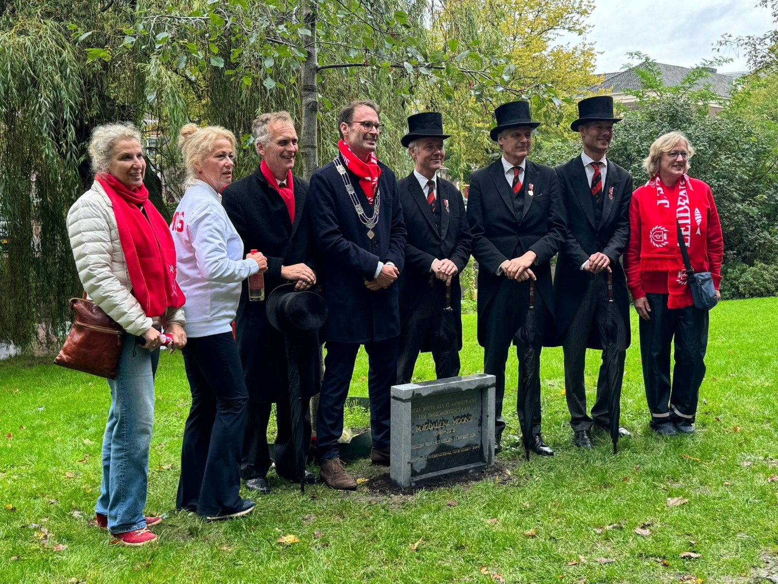 De Soroptimisten legden een krans, waarna de gedenksteen onthuld werd door de burgemeester. Deze gedenksteen is te vinden aan de voet van de ook door de Leidse club geplante witte -roodbloeiende !- els, schuin tegenover het standbeeld van burgemeester Van der Werf.