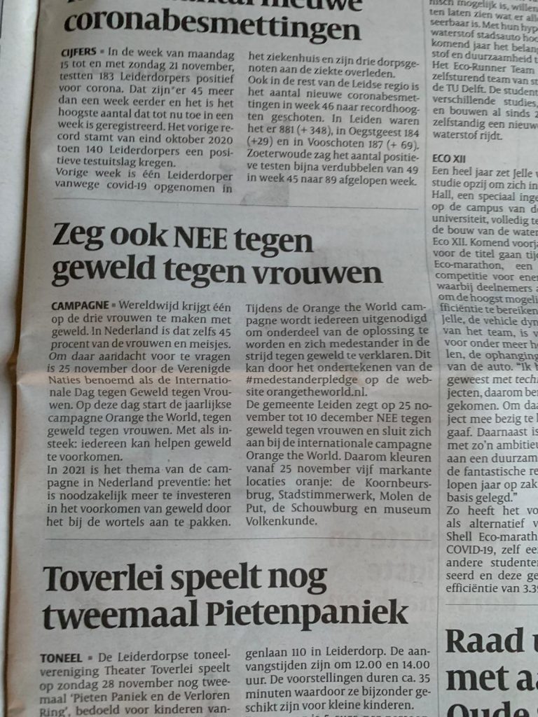 Verschillende kranten hebben aandacht besteed aan het onderwerp en ook radio Sleutelstad heeft een interview met de voorzitter van de OTW club hierover uitgezonden. Nieuws071: Hanneke de Winter over Orange the World geweld tegen vrouwen (18 november) | Sleutelstad