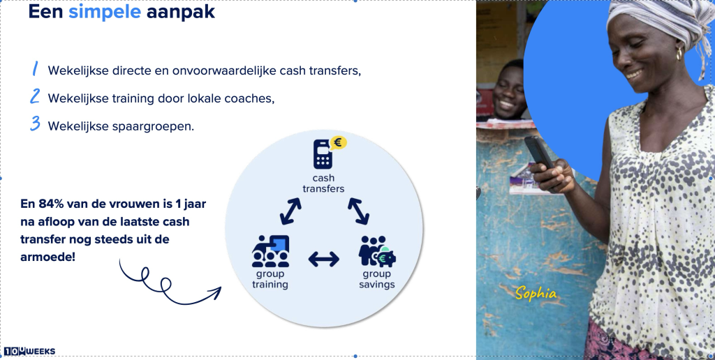 Het Cash+ programma van 100WEEKS is een nieuwe, revolutionaire manier van hulp geven. Door wekelijkse cash, trainingen, en spaargroepen, komt meer dan 80% van de vrouwen binnen 100 weken blijvend uit extreme armoede. Jouw donatie gaat direct naar moeders van gezinnen die zelf heel goed weten hoe uit de armoede te komen.