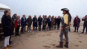 De gids vertelde wat wij allemaal hadden gevonden. vele soorten schelpen, halve krabben, scheermessen, stukken versteend hout,e.d. Wat een bron aan informatie! We dronken een ‘eeuwenoud’ juttersdrankje en toefden weer terug naar de strandtent. We genoten van alle foto’s die de lustrumcommissie uit ons 25-jarig bestaan had geplukt en opgehangen, dat was achen en genieten.
