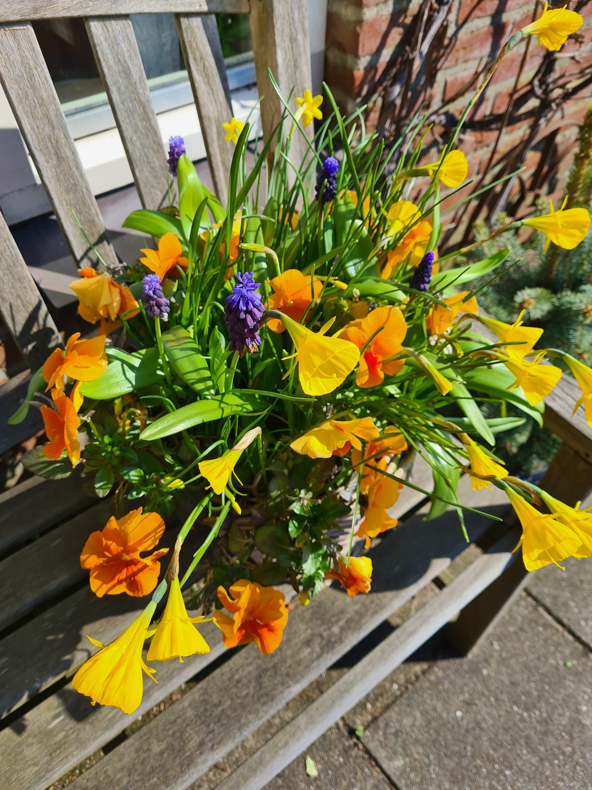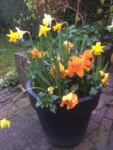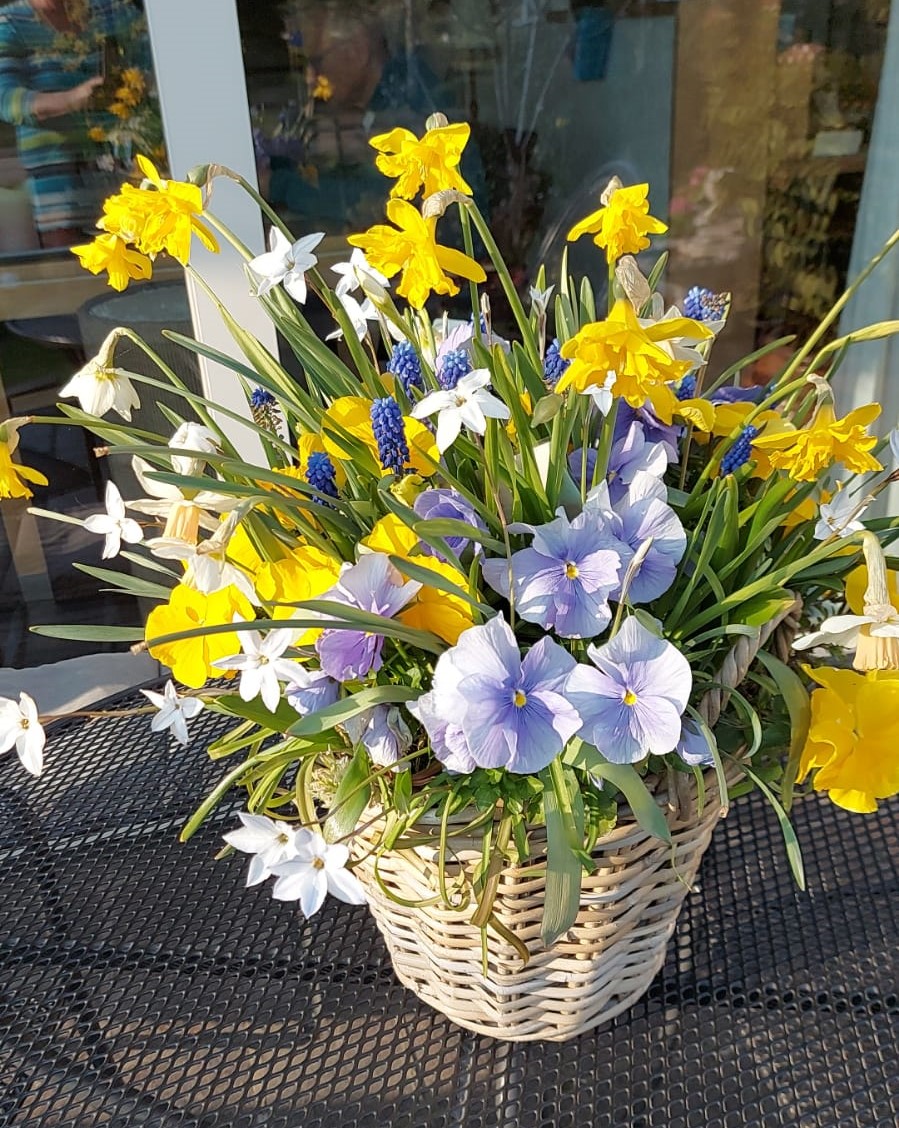 Het is mogelijk om de bollenmix kant-en-klaar geplant in een rieten mand of (antraciet kunststof) pot met violen te kopen (de bolletjes groeien er vanaf februari vrolijk tussendoor).
