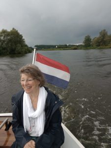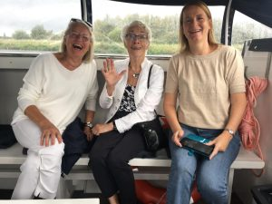 Op zaterdag 24 augustus werden we uitgenodigd bij ons nieuwe lid, Yolanda Kerkvliet, om een vaartocht te maken op de Kagerplassen. Een paar maanden terug vertelde zij in haar LevensWerkVerhaal uitgebreid over het mooie sloepenbedrijf van haar man en haar in Warmond. Inmiddels heeft hun zoon het overgenomen, maar ze wonen er nog steeds naast.  Omdat regen werd verwacht, werd de ontvangst in haar tuin aan het water verplaatst naar de blokhut van het bedrijf. Deze was razendsnel met geel en blauw versierd en bij de koffie en thee presenteerde Trinette allerlei heerlijke zelfgebakken koekjes.