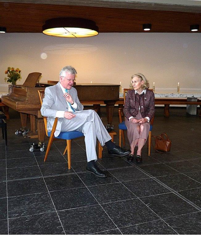 Helga was de enige kunstenaar in de Adventskerk. Deze kerk alleen al is de moeite van het bekijken waard en evenals de Thomaskerk in Amsterdam ontworpen door Karel Lodewijk Sijmons, bij wie duidelijk de invloed van Le Corbusier te zien is. Op zondag 1 juni was er een dienst waarin de predikant het werk van Helga centraal stelde en de liederen en lezingen daarom heen vlocht, waarin een hoofdthema de Barmhartige Samaritaan was. Op een grote wand toonde de beamer haar werk. Het was een verrassend en prachtig geheel. Na afloop was er na de koffie nog een gesprek met Helga, waarin zij over haar inspiratie vertelde en aangaf hoe belangrijk het is dat mensen oog hebben voor elkaar. Dat is voor haar een bron van haar werk en leven en de bijbel zelf. Een heel aantal clubleden en partners waren op zondag aanwezig of werden in de weken erna – op afspraak – door Helga rondgeleid, waarbij er dan bij Helga thuis nog koffie klaar stond!