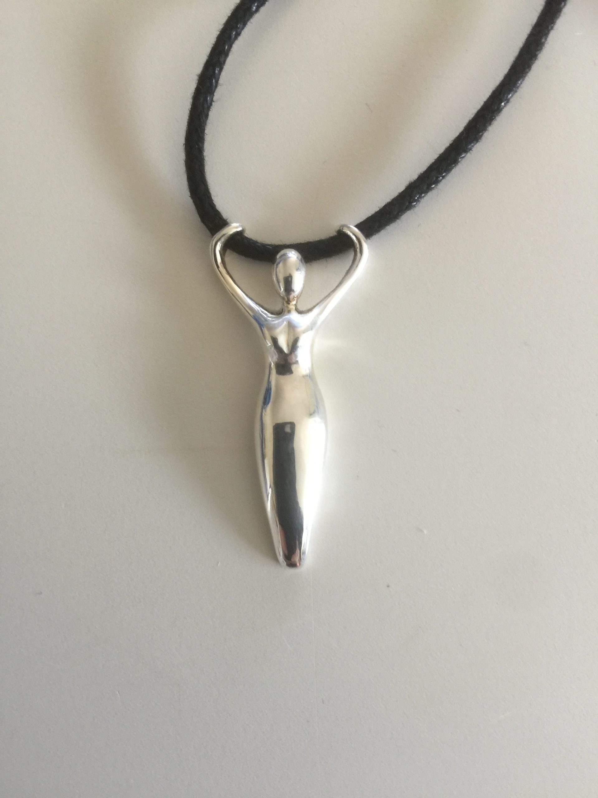De powervrouw-hanger in zilver is 4 cm lang, 2 cm breed en 1 cm dik; het gewicht is 10 gram. Er wordt een zwart koord bij geleverd.