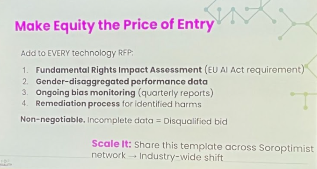 We staan op een cruciaal punt: nu is het moment om AI te vormen, voordat de ongelijkheid die erin zit onomkeerbaar ingebakken raakt. De EU AI Act biedt een wettelijk kader, maar handhaving en controle zijn nodig om te voorkomen dat organisaties aan regels ontsnappen. Impactanalyses moeten echt zijn, niet een afvinkoefening. En genderanalyse moet verplicht worden wanneer AI mensenrechten raakt.