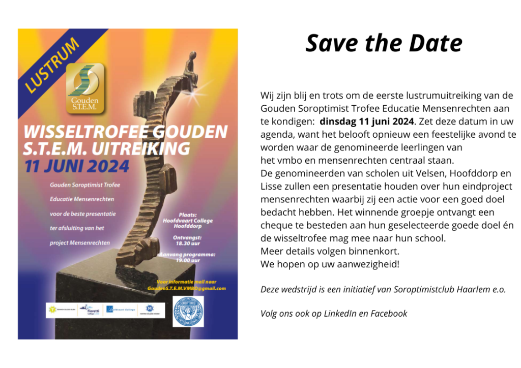 Marie-Anne: “Vier jaar geleden zijn we gestart met de Gouden Soroptimist Trofee Educatie Mensenrechten (S.T.E.M.) om mensenrechteneducatie beter op de kaart te zetten én meer belangstelling te genereren voor het vmbo. Deze opleiding is ontzettend belangrijk, maar krijgt niet altijd de positieve aandacht die het verdient.” Tineke vervolgt: “De leerlingen die meedoen aan deze wedstrijd zijn gemiddeld pas vijftien jaar, maar al zo goed in staat om mee te denken over maatschappelijke problemen én om daar een ludieke inzamelingsactie voor te bedenken. Hun creativiteit en vindingrijkheid zijn bewonderingswaardig.”