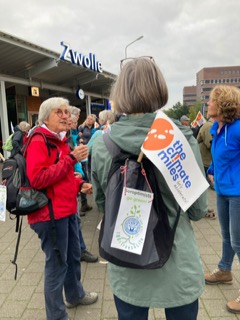Op onze rugzak zit de tag met de tekst “ Soroptimists go green”. Dat blijkt een goede aanleiding te zijn voor menig gesprek over het Soroptimisme, onze doelen en vooral onze plannen om bomen te planten in Zwolle en/of Kampen.