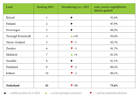 Een score van ‘0’ staat voor 100 procent ongelijkheid, bij een score van ‘100’ is de kloof gedicht. Nederland scoort op dit moment 75,6 procent. Vorig jaar was dat nog 77,5 procent. Wat betekent dit precies?