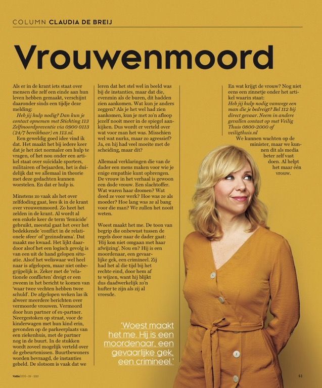 Naar aanleiding van een column van Claudia de Breij voor de VARA heeft de presidente van Soroptimist Nederland, Suriname en Curaçao er bij de redactie van de NOS op aangedrongen de door Claudia de Breij voorgestelde disclaimer toe te voegen aan alle artikelen over geweld tegen vrouwen. Lees brief presidente.