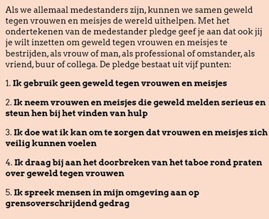 Belangrijkste punt is dat we besloten door te gaan op de vorig jaar ingeslagen weg. Met de #medestander campagne (zie kader) proberen we zo veel mogelijk partijen zich te laten uitspreken vóór het aanpakken van geweld tegen vrouwen én actie te laten ondernemen. We zetten in op verbreding van de campagne naar de sportwereld en proberen ook zoveel mogelijk mannen medestander te maken.