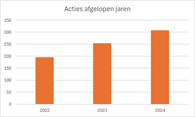 In de figuur kun je zien hoeveel acties we afgelopen jaren hebben ondernomen. Dit is een duidelijk stijgende lijn, daar kunnen we trots op zijn.
