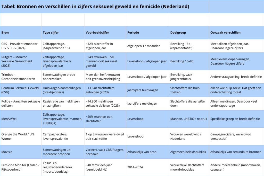 De cijfers spreken elkaar niet tegen, maar laten verschillende kanten van hetzelfde probleem zien. CBS en Rutgers geven inzicht in hoeveel mensen slachtoffer zijn, politie en Centrum Seksueel Geweld tonen wat er zichtbaar is via hulpvragen en aangiftes, MenAsWell en Orange the World maken duidelijk dat specifieke groepen geraakt worden en benadrukken de urgentie. De Femicide Monitor laat zien hoe ernstig het kan aflopen.