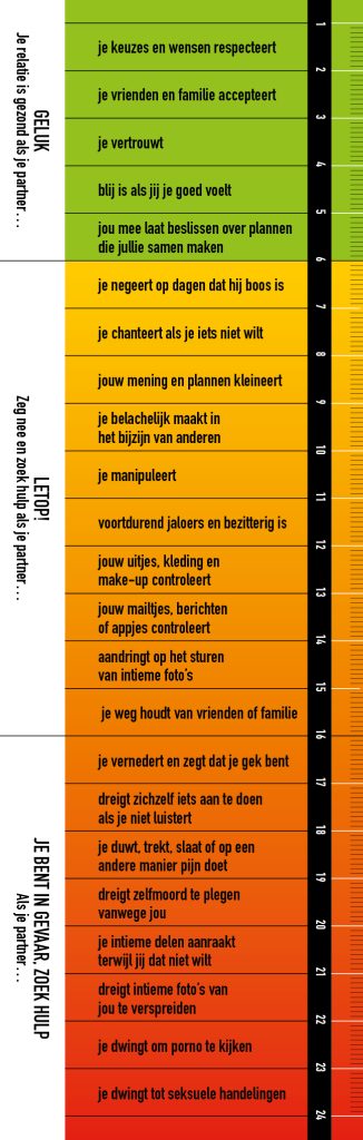 Naar aanleiding van de campagne “Is dit Liefde?” heb ik contact gehad met het Landelijk Netwerk Veilig Thuis. Zij geven aan dat hun materialen ook uitstekend inzetbaar zijn tijdens Orange the World, maak daar dus gerust gebruik van. Ze hebben bovendien meegekeken naar de zichtbaarheid van Veilig Thuis op onze eigen flyers en boekenleggers.