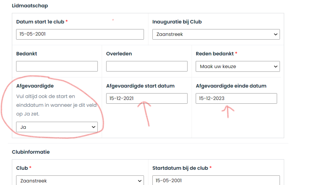 De clubsecretaris kan op eenvoudige wijze voorafgaande aan elke RvA de juiste leden als afgevaardigden kenmerken in de ledendatabase. Je moet aangeven van welke datum tot welke datum een persoon afgevaardigde is. Zorg ervoor dat de begindatum voor, en de einddatum na de betreffende RvA zijn en zorg ook dat er niet meer dan twee afgevaardigden in de database staan!