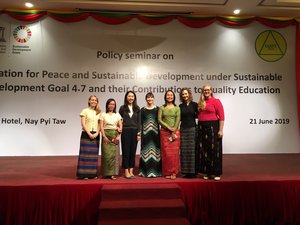 ENG: Prof. Felisa Tibbitts, Chair in Human Rights Education, traveled to Myanmar in June to carry out a Policy Seminar with the Ministry of Education on the inclusion of themes of Education for Sustainable Development and Peace within the national curriculum. This seminar is supported by the UNESCO Office in Myanmar and involved over 100 representatives from the government, inter-governmental agencies and civil society. The Ministry agreed to continue working with UNESCO in these thematic areas and Prof. Tibbitts is preparing an Options Paper for next steps.