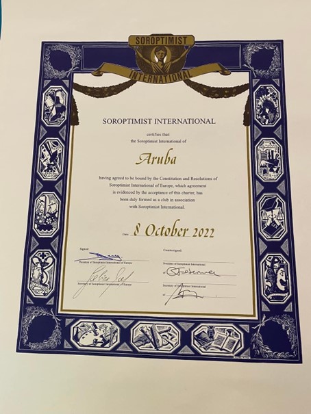Het was een groot Soroptimistfeest op Aruba: op donderdag een kennismaking tijdens happy hour met prachtige carnavaldansers, op vrijdag een galadiner met steelband en op zaterdag de charter-ceremonie met voorafgaand het voorlezen van de statuten en ondertekening door alle leden van de charterliist. De eilandbewoners, 110.000 personen, waren via een radio-interview al op de hoogte gebracht, waardoor zelfs op woensdag nog een speciale persbijeenkomst moest worden georganiseerd met radio, tv en krant. Dit leverde ook meteen al een paar nieuwe leden op!