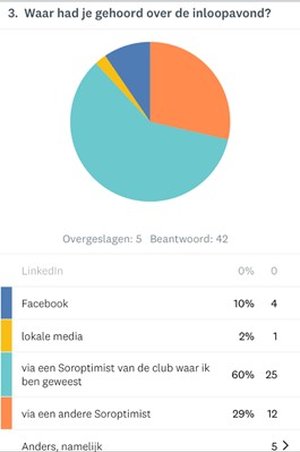 Van alle vrouwen die reageerden op de uitnodiging voor een inloopavond, hoorde 60 procent via een Soroptimist van de inloopavond. Er is dus genoeg animo in ons eigen netwerk. De meeste geïnteresseerden noemden op het aanmeldformulier LinkedIn, op de vraag waar ze van de inloopavond hadden gehoord.