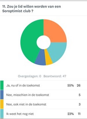 Levert een kennismaking met Soroptimist Nederland nou iets op? Zeker: 115 aanmeldingen kwamen binnen via het aanmeldformulier op Soroptimist.nl, waarvan 28 voor een regio zonder inloopavond. Daarnaast werden er 25 aanmeldingen direct van clubs of direct naar de mailbox van de commissie ‘Breng SorOptimisme in je leven’ gestuurd. In december hebben alle vrouwen die zich hadden gemeld voor een inloopavond een enquête ontvangen: zowel geïnteresseerden als clubs. Dit leverde reacties op van 47 vrouwen, van wie 93 procent naar een inloopavond is geweest en van 27 clubs.
