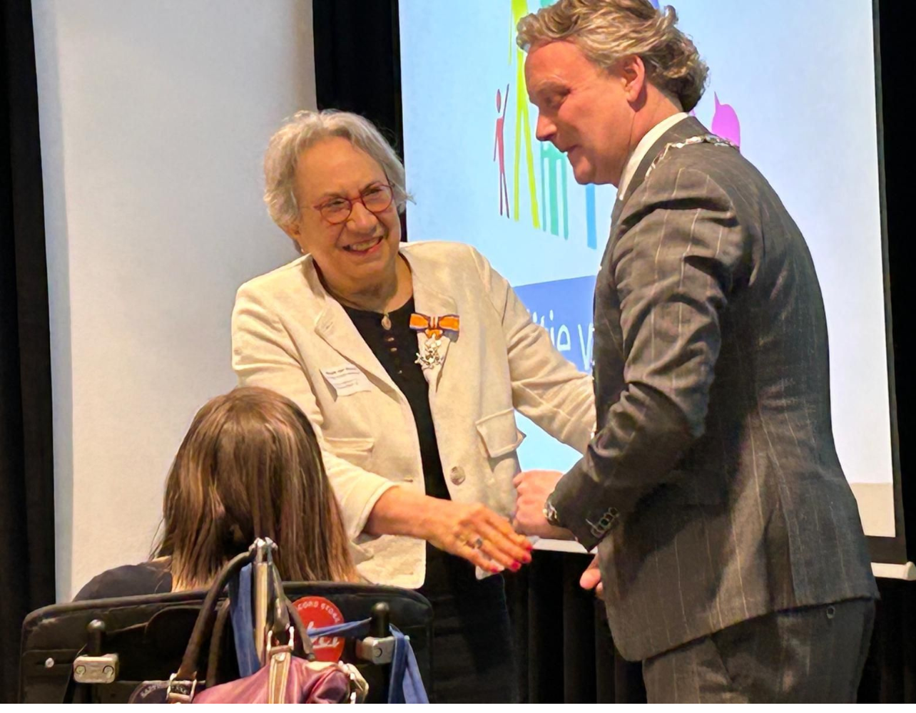 Op 17 maart is Meg van Hoeve, nu Vriend van de Unie, benoemd tot Ridder in de Orde van Oranje Nassau!! Onze burgemeester Pieter Verhoeve heeft haar tijdens een werkconferentie in Utrecht verrast met een bezoek om de Koninklijke onderscheiding uit te reiken. Zij heeft deze gekregen voor haar buitengewone inzet voor gelijke kansen en rechten voor mensen met een beperking. Zo is zij actief voor de Stichting Inclusie Nederland op het gebied van wetgeving, en beleid en uitvoering daarvan. Daarnaast is zij lid van de Goudse Adviesraad voor mensen met een beperking.