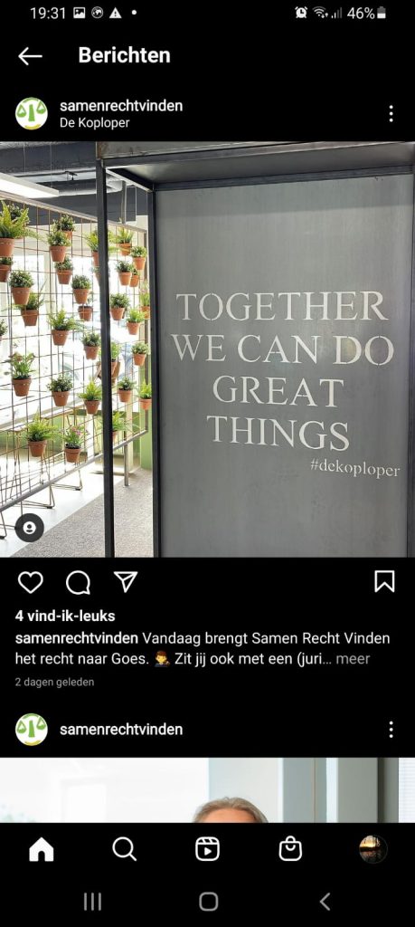 “Na 28 jaar hing ik mijn advocatentoga aan de wilgen en zo stond ik 2 jaar geleden aan de basis van Samen Recht Vinden. In een ‘SRV-busje’ proberen we het recht dichter bij burgers te brengen. Dat doen we door ‘samen’ te zoeken naar de beste oplossing voor alle betrokkenen. Die oplossing kan ook praktisch zijn: zoals een lager dak van een fietsenhok voor minder overlast voor buren. Zo probeer ik – altijd samen met anderen – verschil te blijven maken in mensenlevens.