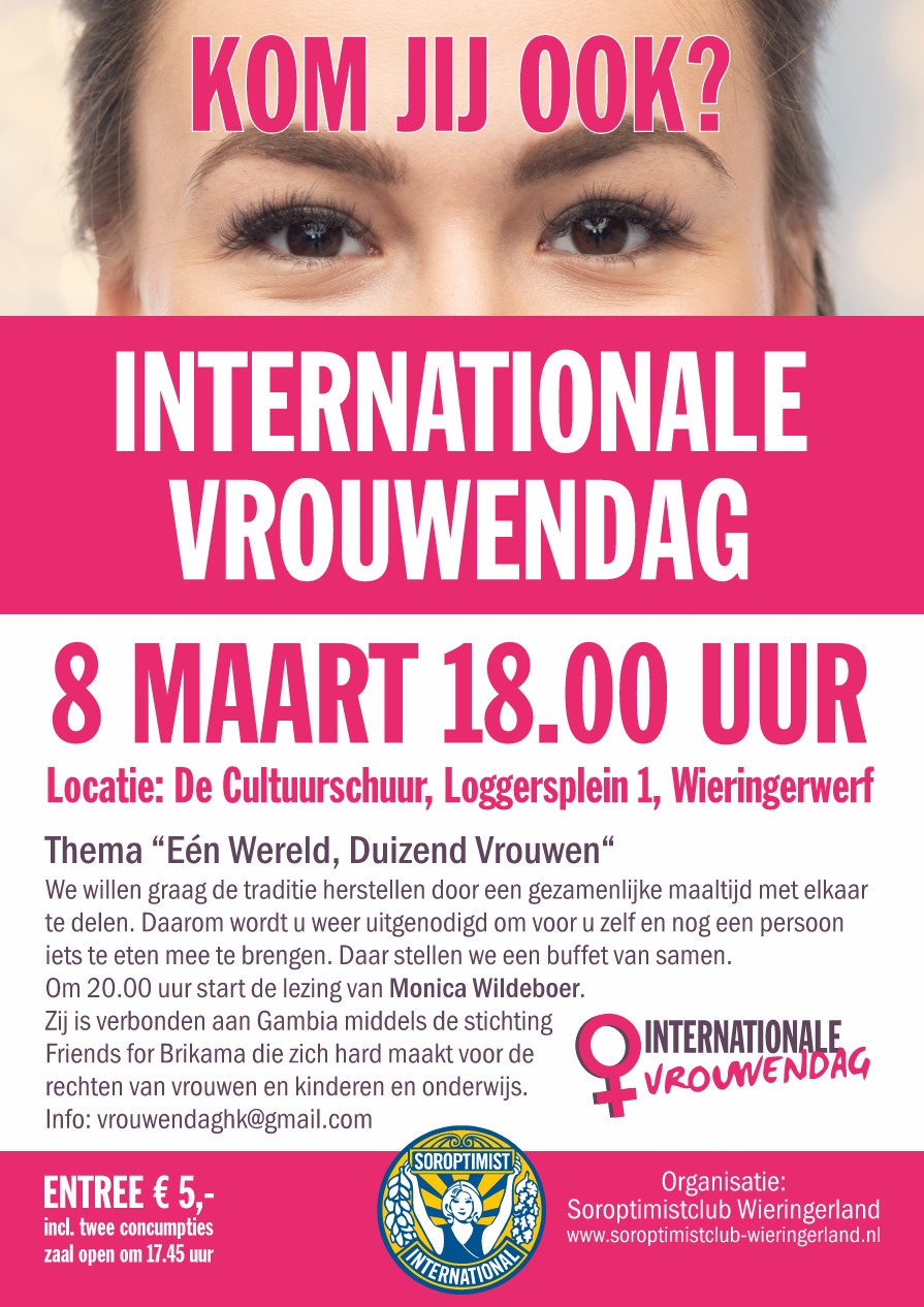 In de Cultuurschuur in Wieringerwerf op kwamen we op 8 maart samen voor een buffet van eigengemaakte gerechten en een lezing over de stichting Friends for Brikama in Gambia. Soroptimistclub Wieringerland schonk een nagekeken handnaaimachine zodat een vrouw in Gambia haar brood daarmee kan verdienen. Een geslaagde viering!