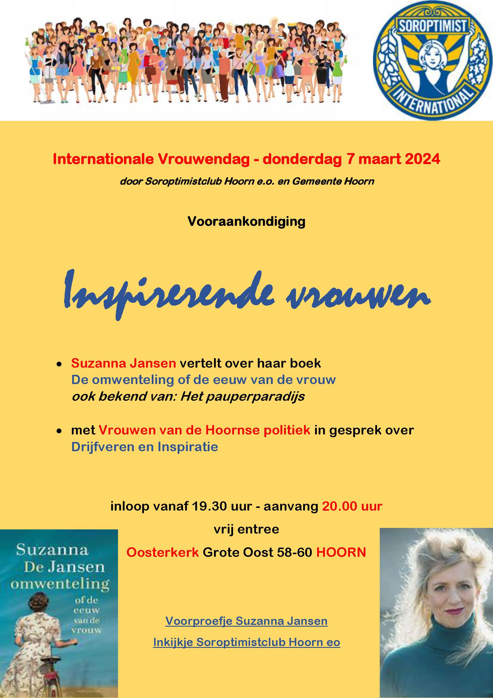 Op 7 maart organiseerden wij in samenwerking met Raadkrachtige Vrouwen Hoorn een succesvolle avond in de Oosterkerk met als thema ‘Inspirerende vrouwen’. Ruim 200 bezoekers luisterden deze avond naar gastspreker Suzanna Jansen, schrijfster, over haar boek ‘De omwenteling of de eeuw van de vrouw’.