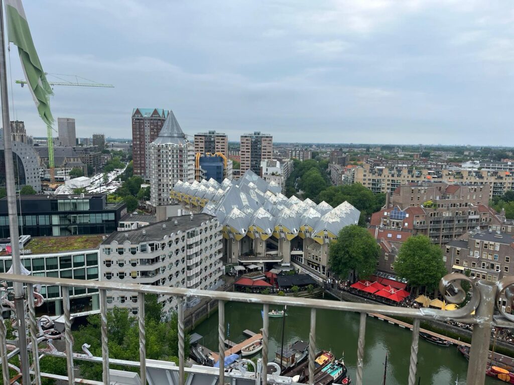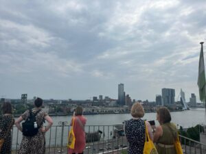 Na de lunch nam ik deel aan een rondleiding door het hart van Rotterdam. Onder de bezielende leiding van een stadarcheoloog leerden we hoe Rotterdam is ontstaan. We mochten zelfs een aantal voorwerpen vasthouden en ruiken, zoals vierhonderd jaar oud leer van een schoenmaker die het in de beerput had achtergelaten en een bot van een koe dat gebruikt werd als schaats. Het (letterlijke) hoogtepunt was dat we op de het Witte gebouw, de eerste wolkenkrabber van Europa, van het uitzicht mochten genieten.