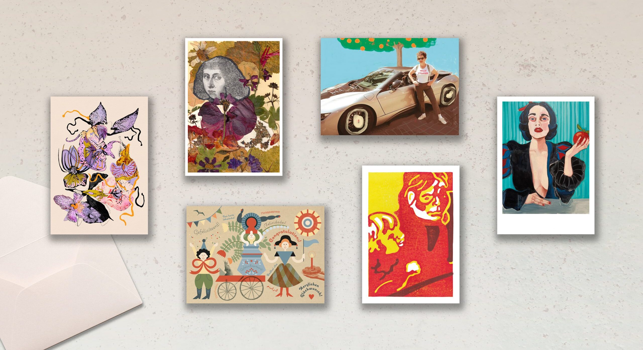 Over de ontwerpen van de kunstenaressen: de jonge kunstenares Stefanie Nypels heeft de orchidee als uitgangspunt genomen omdat deze bloem voor haar de rijkdom, kracht en schoonheid van de vrouw symboliseert. Voor ontwerpster Anastassia Solovieva is de 17e-eeuwse geleerde Anna Maria van Schurman een grote inspiratiebron. Annelien Dam maakte een werk met de titel Hera en Hebe: de vrouw en de jeugd. Debbie Voerman schilderde een geweldig stoer portret van Sneeuwwitje. En kunstenares Quinta Bies vindt dat we elkaar meer moeten ‘omarmen’ en zet met haar ‘Hello Stranger’ kaart de eerste stap. En natuurlijk is er een felicitatiekaart! Judith Hofmann ontwierp een vrolijke verjaardagskaart met gelukwensen in verschillende talen. Leuk weetje: dit zijn de talen uit de herkomstlanden van de Dunya-clubleden.
