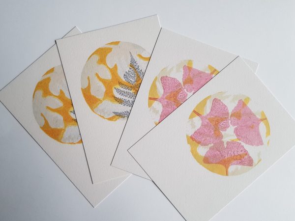 Een hele zonnige kaartenset bestaand uit 4 kaarten in 2 verschillende motieven, gemaakt door een eigen clublid. De kaarten zijn gedrukt van een handgemaakt orgineel werk, in mooie warme kleuren. Er zijn verschillende bladeren voor gebruikt, waaronder ginkoblad, varen,- en vijgenbladeren. Het zijn enkele kaarten en gedrukt op mooi dik, wit papier.