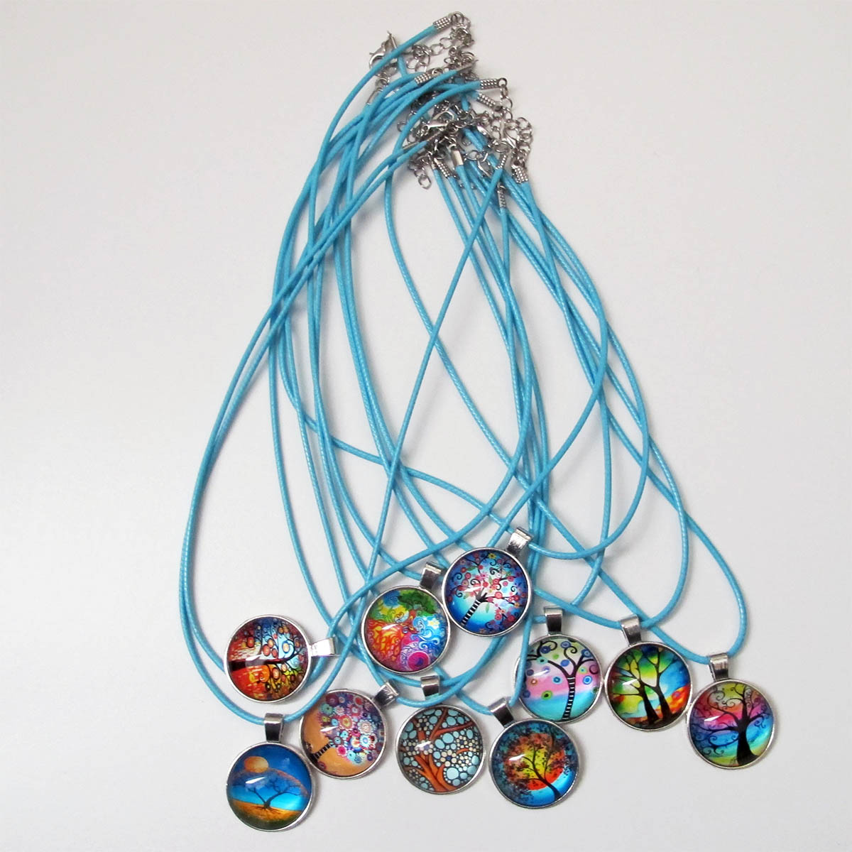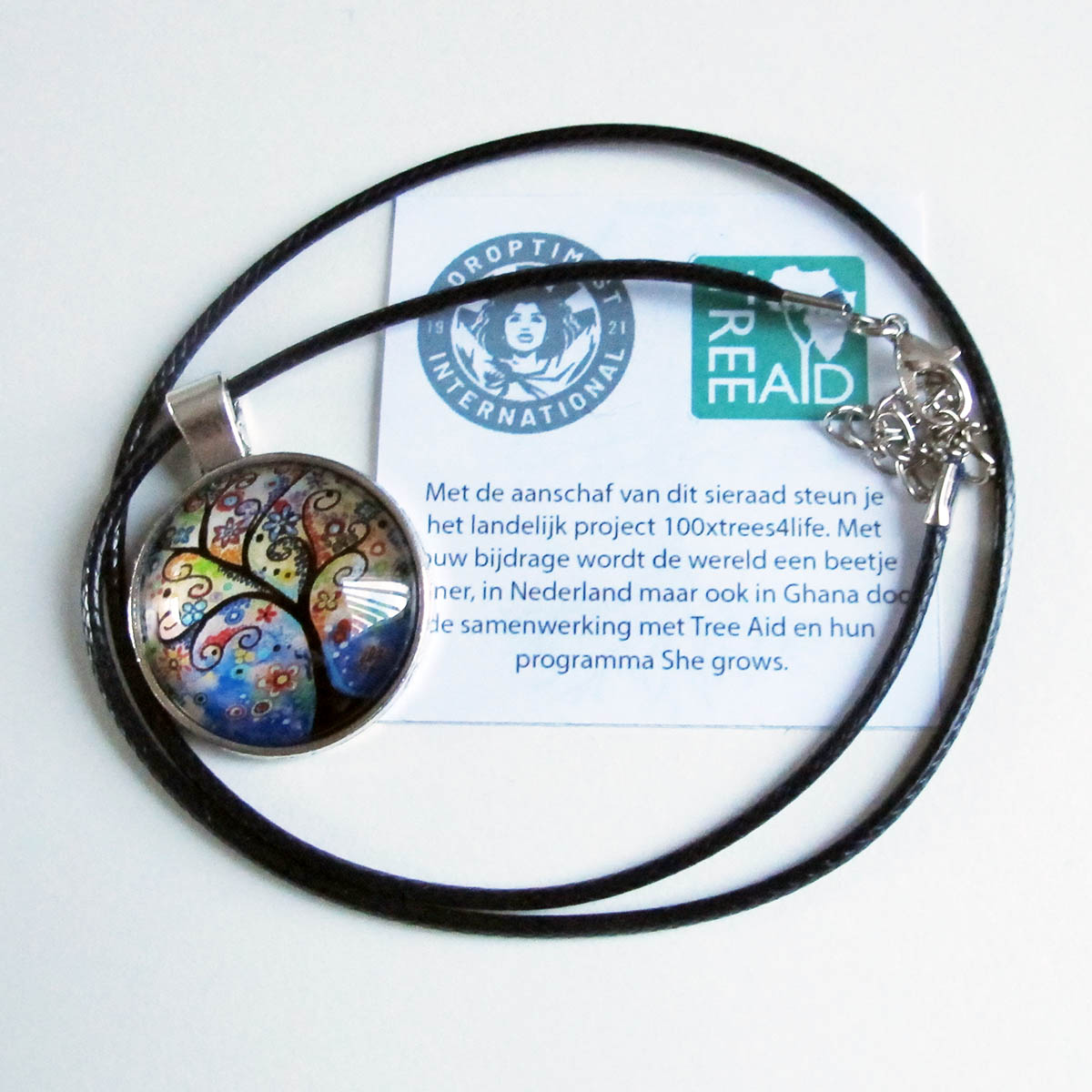 Club Breda heeft voor de actie Trees4Life kleurrijke kettingen met zeer kleurrijke afbeeldingen van bomen te koop. De afbeeldingen van de bomen (2,5 cm rond achter glas) zijn verschillend en zoveel als mogelijk qua kleurstellingen in de kleur van de ketting (lengte 42 cm + verlengen met 4,5 cm). Bij de bestelling kun je de kleur van de PU lederen ketting aangeven. Het is via de website niet mogelijk om de voorkeur van een afbeelding aan te geven. De aan te geven kleuren zijn: wit, geel, rood, oranje, turquoise, kobaltblauw, donkerblauw, paars, lila, roze en aubergine. Alle kettingen zitten in feestelijk gekleurde sieraden zakjes. Van alle kleuren is er een beperkte oplage. Onze feestelijke cadeautip bij een bedankje. Bestellen kan via: breda@soroptimist.nl