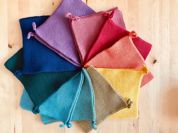 Met de hand gemaakte pannenlappen van ecologisch katoen. Per paar doneert Club Rotterdam €9 aan Stichting Fier.