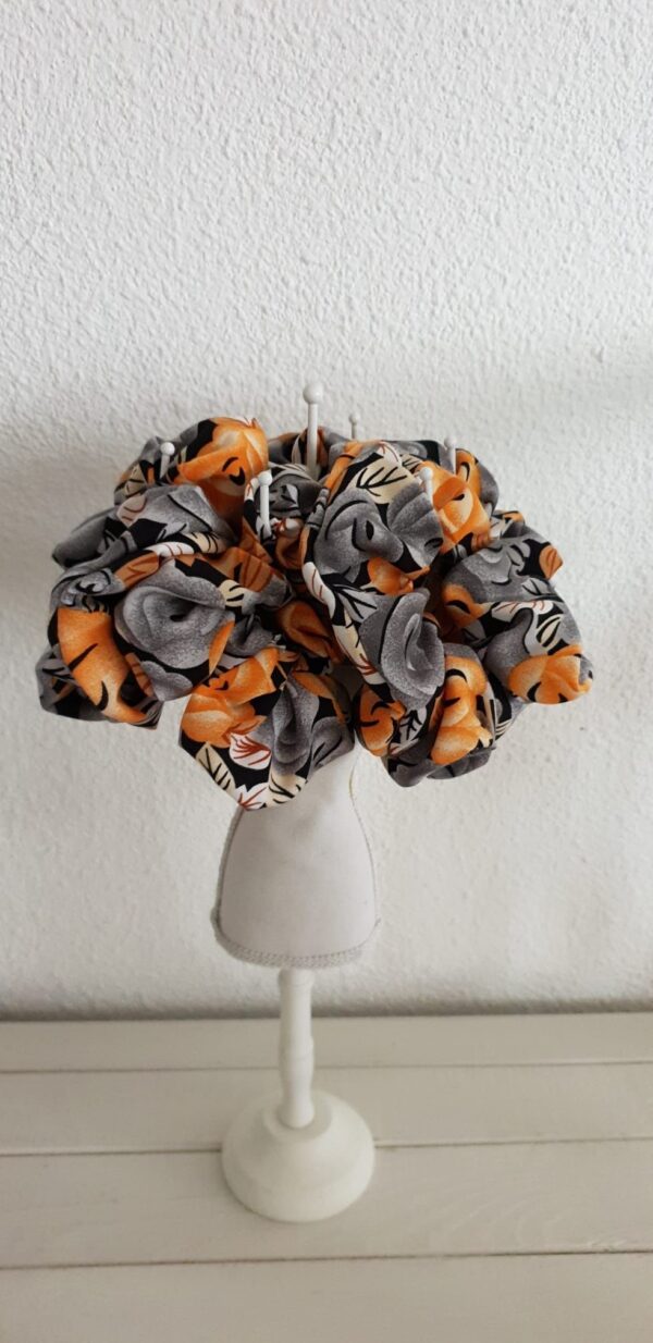 Een scrunchie in de kleur oranje en grijs.