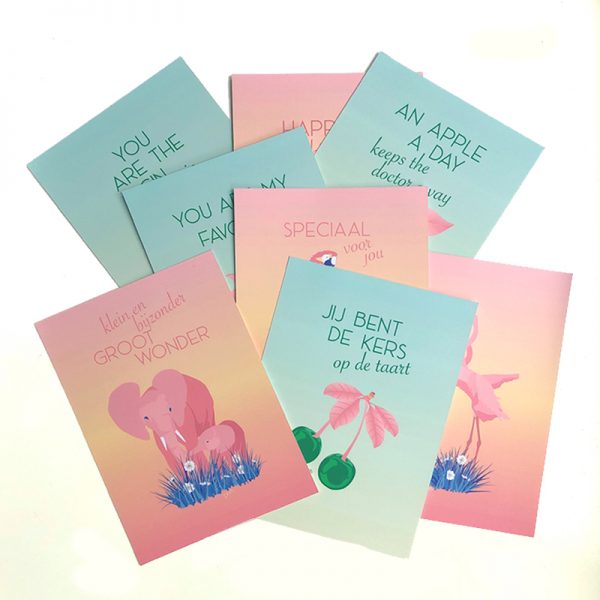 Een set van 8 verschillende ansichtkaarten te gebruiken bij diverse gelegenhedden. Zo heb je dus altijd een kaart om te versturen in huis. De kaarten zijn een uniek ontwerp van Desiree Kramer. De opbrengst komt ten goede aan Vluchtelingenwerk Vught. Dankzij jouw bijdrage kunnen nieuwkomers in Vught met een achtergrond als vluchteling begeleid leren fietsen.