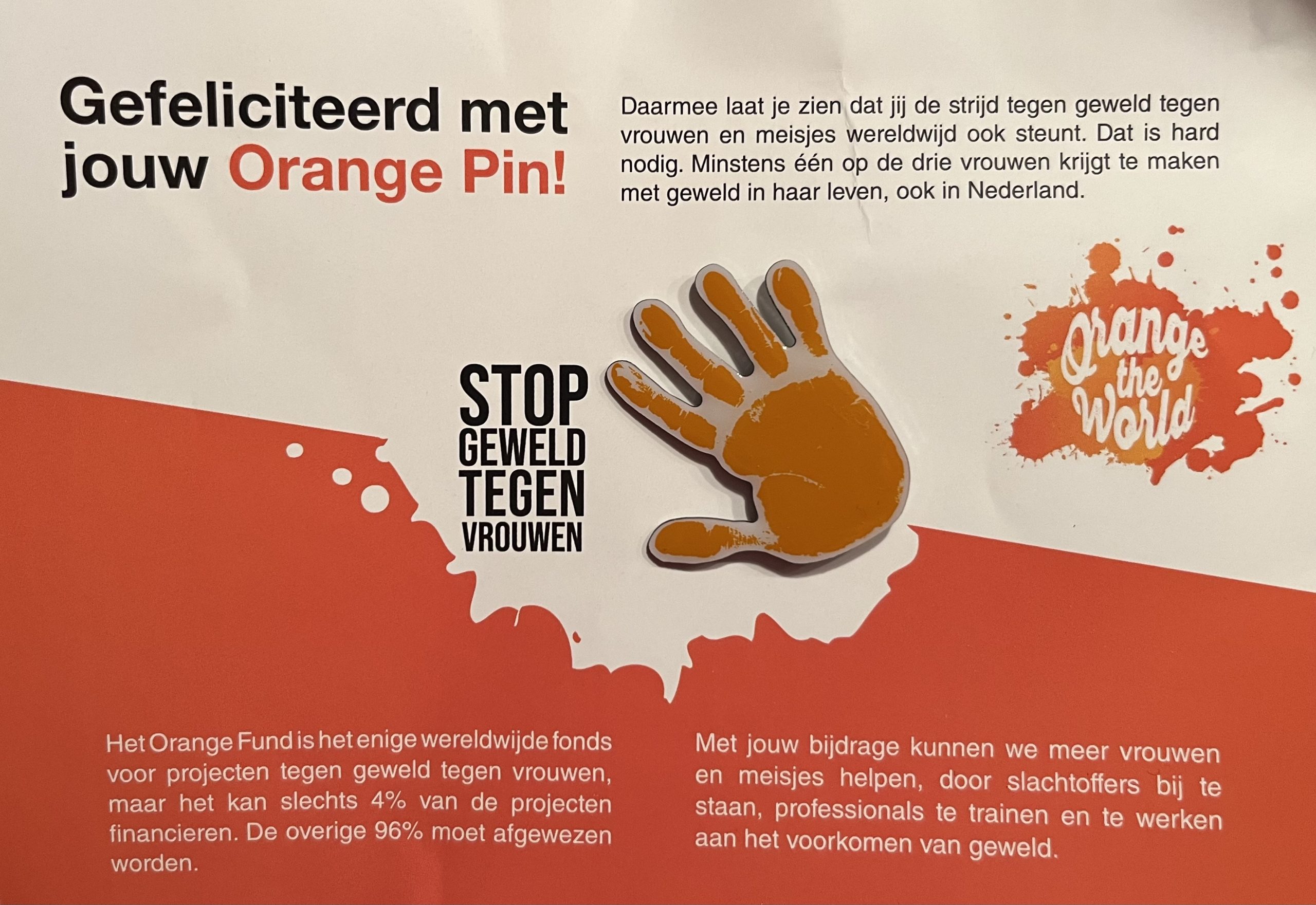 Speldje “Orange the World” (LET OP: alléén verkrijgbaar via donatie aan UN Women, dus NIET via winkelmandje; zie tekst)