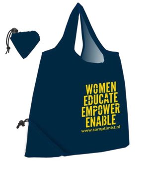 Deze boodschappentas kan tot zeer klein opgeborgen worden in een hoesje dat is bevestigd aan de tas. Wanneer de tas is uitgevouwen heeft deze een formaat van 40×44 cm. In Soroptimist kleuren, eenzijdig bedrukt.