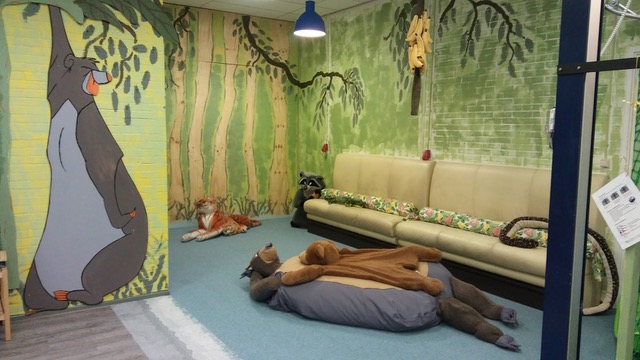 Voor Bio Vakantieoord werd een prachtig speels en kunstzinnig plan ontwikkeld voor een recreatieruimte voor gehandicapte kinderen en hun broertjes en zusjes. De filmklassieker Jungle Boek werd het uitgangspunt voor het ontwerp omdat de voormalige ruimte Baloe werd genoemd. Samen met de dames van Vice Versa Gelderland (vrouwelijke ondernemers) zijn we enkele maanden in touw geweest om een origineel ontwerp te realiseren en materialen gesponsord te krijgen voor dit project. Op 12 oktober werden dan echt de handen uit de mouwen gestoken en werden muren geschilderd, prachtige wandschilderingen gemaakt, kussen en gordijnen genaaid en nieuwe vloeren gelegd. De speelzaal werd omgetoverd in een ware jungle, inclusief bananenbomen.
