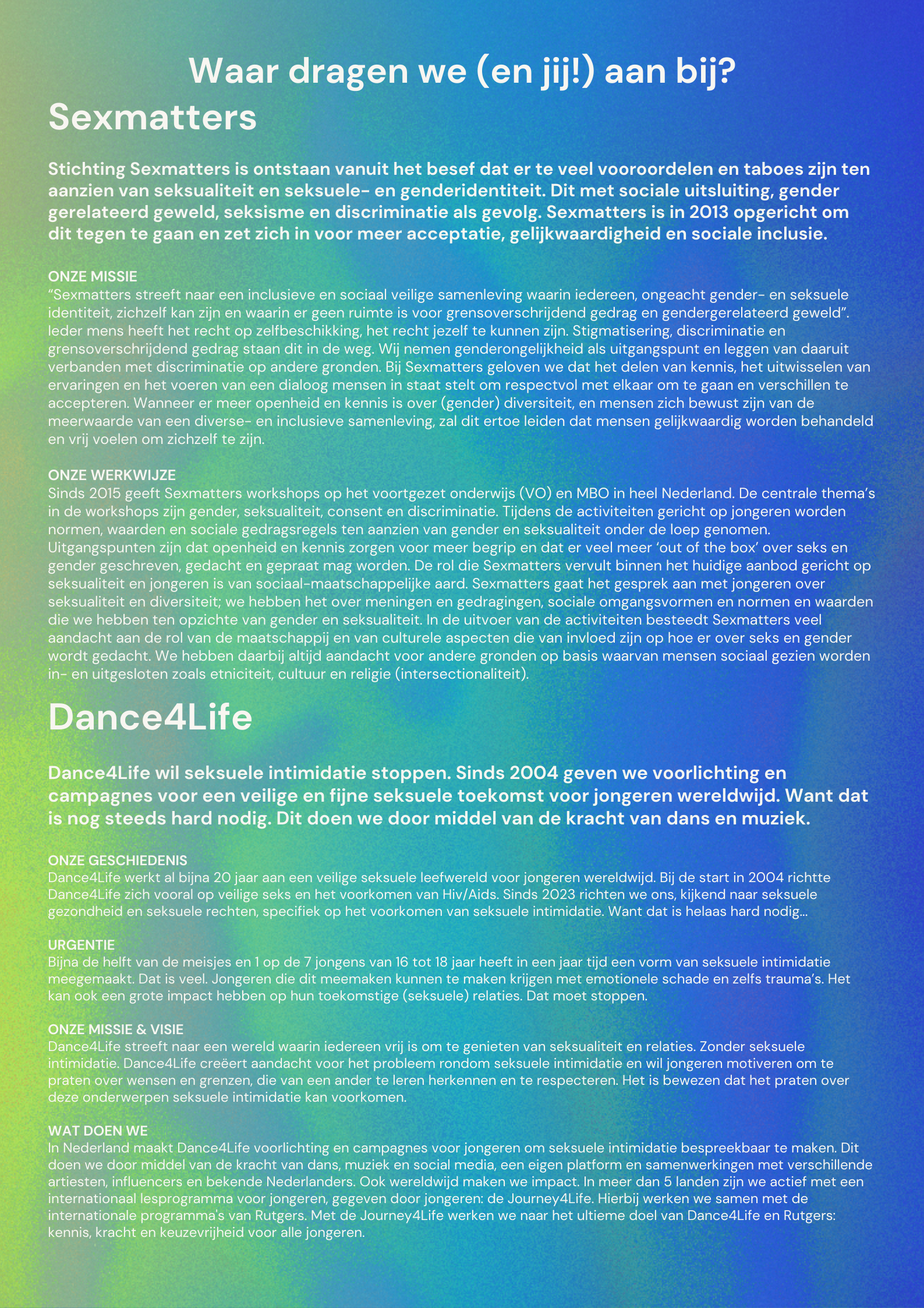 Dance4Life: bijdragen aan een samenwerken om op langere termijn seksuele gezondheid onder jongeren te stimuleren (breed en lange termijn).
