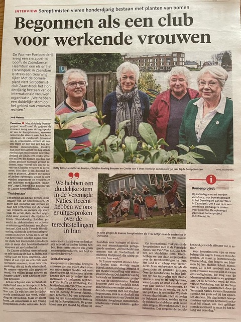 Voor Soroptimisten zijn er twee belangrijke dagen: 8 maart en 10 december. ,,8 maart is Internationale Vrouwendag, dan leggen we bloemen bij het Hannie Schaft Monument. Zij is het symbool van hoe sterk vrouwen kunnen zijn in zware omstandigheden. De Dag van de Mensenrechten pakken we grootser aan. Op 10 december werd de Universele Verklaring van de Rechten van de Mens aangenomen door de Verenigde Naties. Eleanor Roosevelt speelde een grote rol bij het opstellen daarvan. Die dag komen Soroptimisten van boven het Noordzeekanaal bij elkaar, om met gelijkgestemde zielen stil te staan bij het belang van deze dag.’’