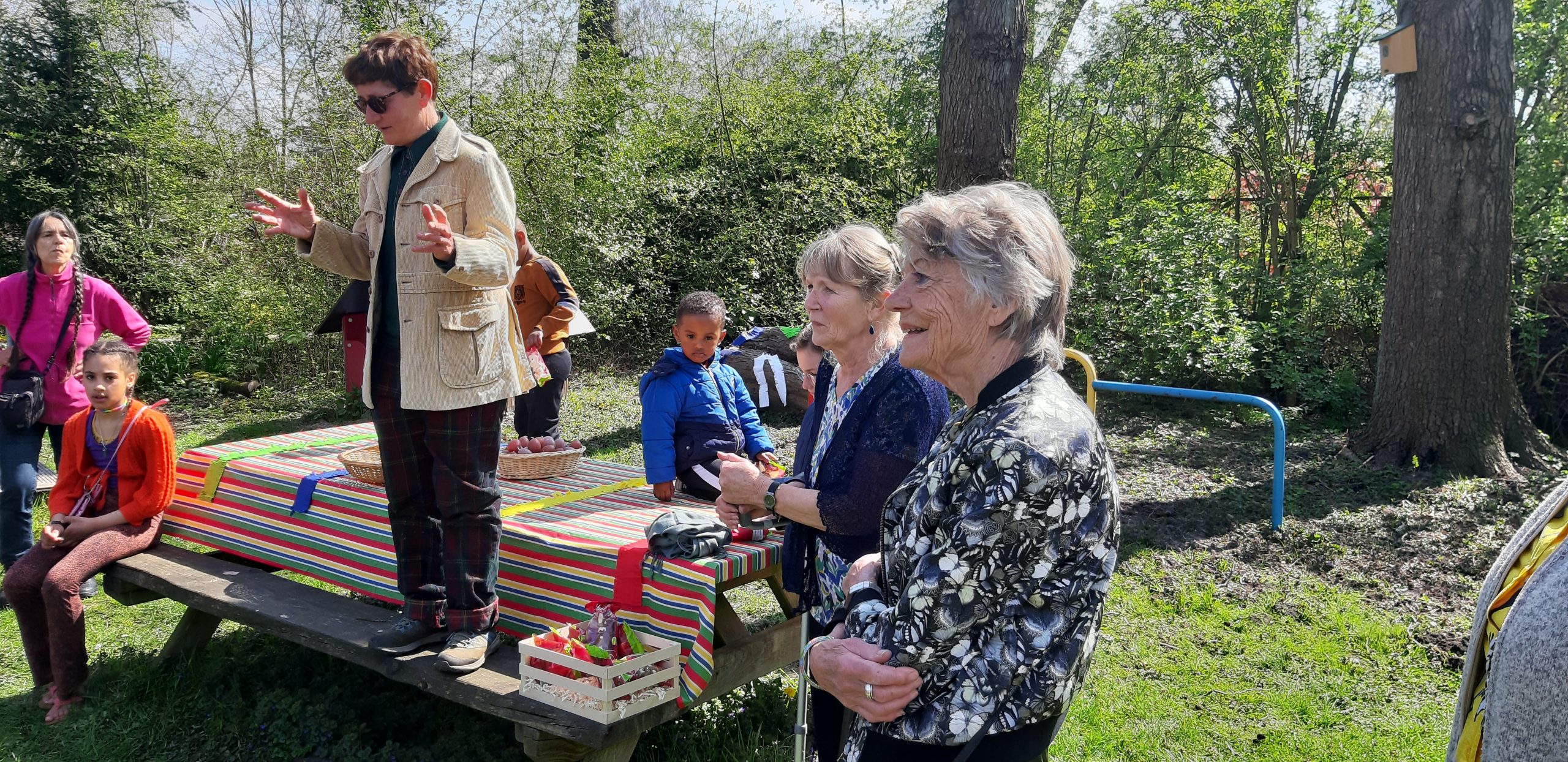 ‘Vroege Vogel’ en bestuurslid van Tuincomplex de Wijkergouw Andrea van Pol opent de boomplant ceremonie.