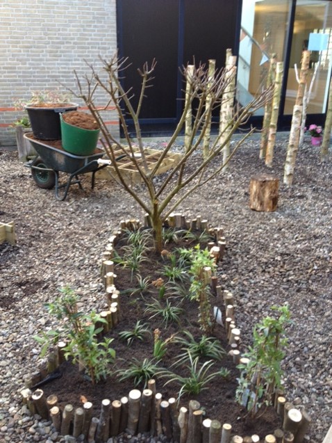 Een ‘Tuin van de Ziel‘ werd geboren. Er werden struiken gerooid, onkruid en grind verwijderd en tuinaarde werd aangebracht. Er verrezen mozaïekkunstwerken op de grond, op houten huisjes en potten, tuinmeubilair werd opgeknapt, moestuinbakken werden geplaatst, fruitbomen, struiken en planten werden geplant, noem maar op. Het resultaat was geweldig, ook dankzij de inzet van diverse sponsoren, zowel bedrijven als particulieren!