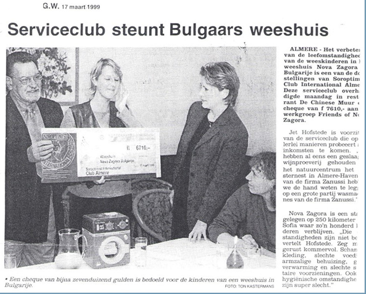 De leefomstandigheden van zo’n 100 weeskinderen in weeshuis Nova Zagora, zo’n 100 km van Sofia (Bulgarije), zijn verbeterd door de aanschaf van 4 wasmachines en drogers. Dit geld werd ingezameld door o.a. een wijnproeverij in ’t Eksternest in Almere. Door de medewerking van de firma Zanussi konden de machines voordeliger worden aangeschaft en bleef er nog geld over voor de aanpassing van de technische voorzieningen in de wasruimte van het weeshuis.