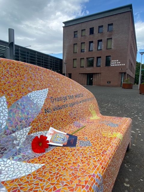 De bank is niet alleen een rust- of ontmoetingsplek, maar het is ook een bank, die aandacht vraagt om geweld tegen vrouwen en meisjes te stoppen.